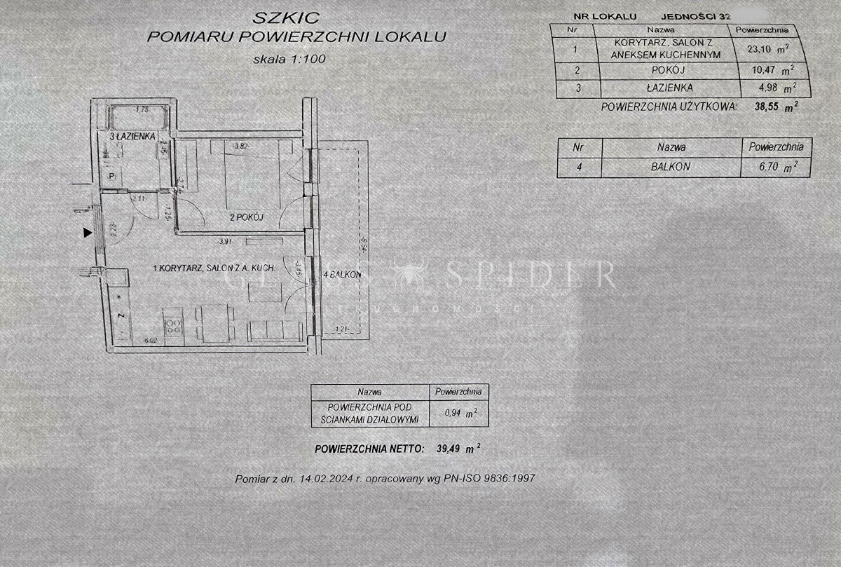 Powierzchnię mieszkania (38,55 m²) stanowią:• korytarz, salon z aneksem kuchennym - 23,10 m²