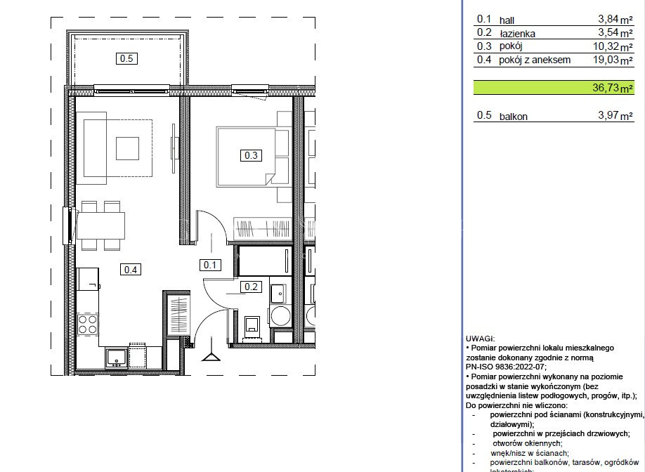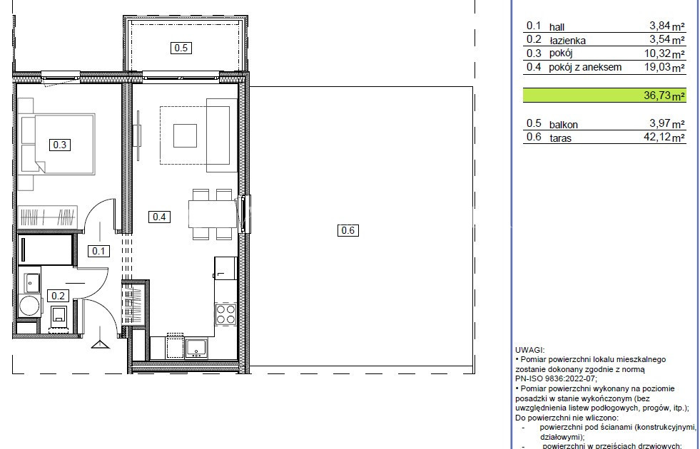 • pokój z aneksem kuchennym - 16,67 mkw.