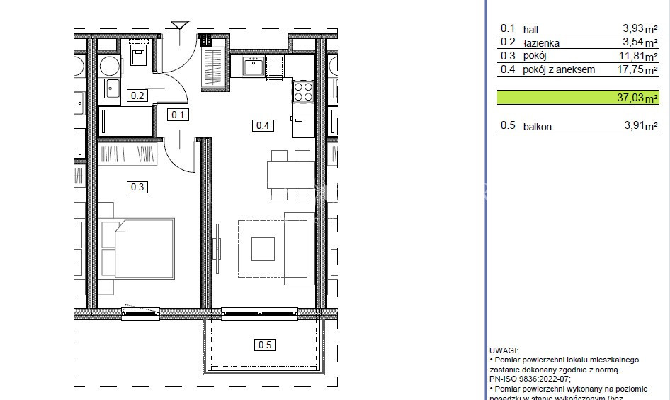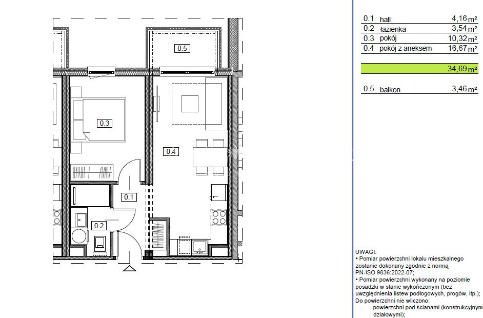 Powierzchnia mieszkania (34,69 mkw.):• hol - 4,16 mkw.