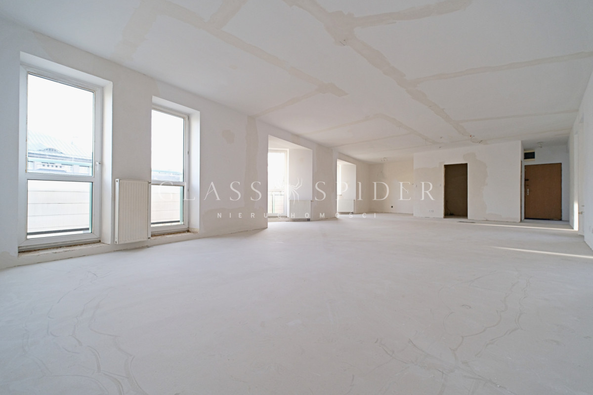 Obecny układ mieszkania to otwarta przestrzeń o powierzchni 82,48 mkw., co pozwala na dowolne wydzielenie pomieszczeń - np. salonu z aneksem kuchennym, dwóch sypialni, gabinetu, garderoby i łazienki.