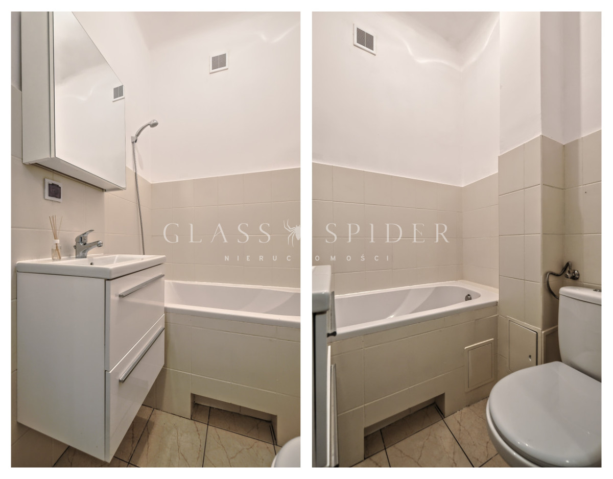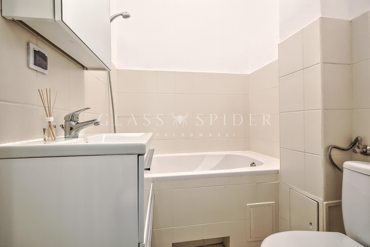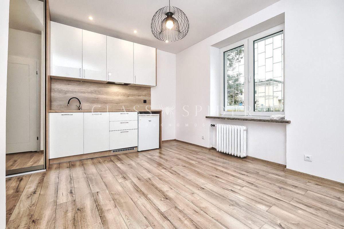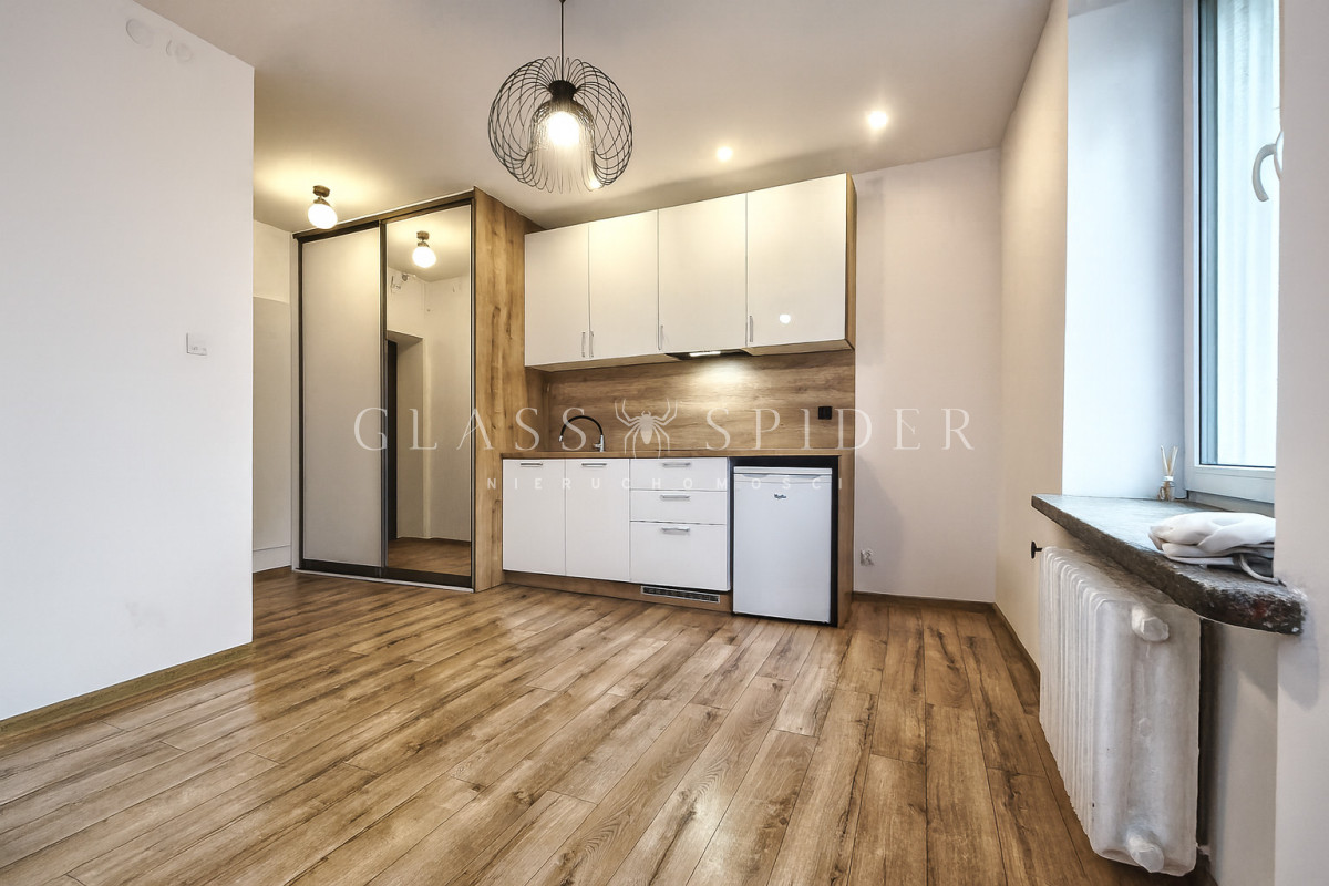Mieszkanie składa się z przestronnego pokoju z aneksem kuchennym, łazienki z wanną oraz przedpokoju z dużą szafą wnękową z miejscem na pralkę. Mieszkanie jest jasne i przestronne, o wysokości 270 cm, po generalnym remoncie -