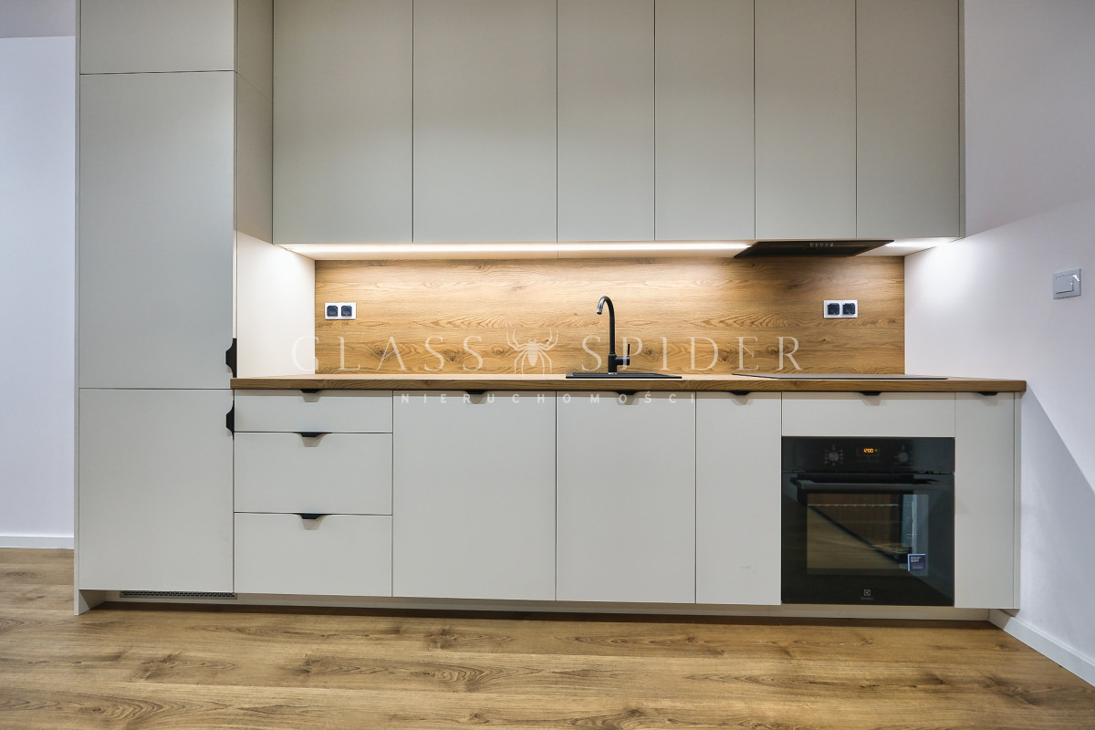 zabudowany aneks kuchenny ze wszystkimi sprzętami AGD (lodówka, piekarnik, płyta indukcyjna, zmywarka, okap). Natomiast po lewej stronie