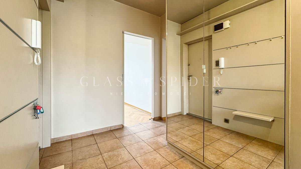 • Przestronny przedpokój z dużą szafą w zabudowie z lustrem.