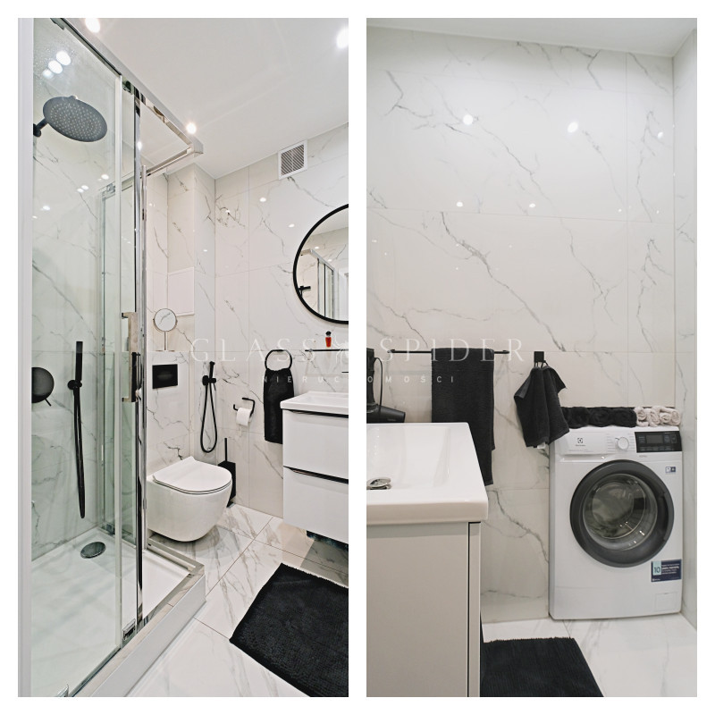 Łazienka z prysznicem i pralką.