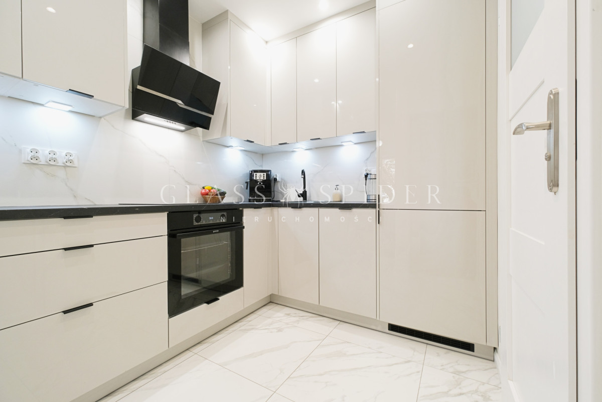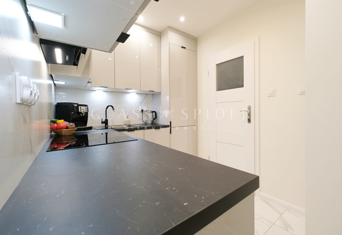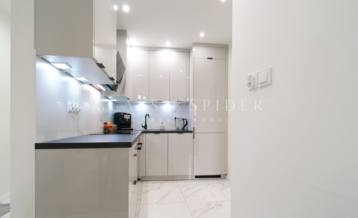 Kuchnia z dużą ilością miejsca do przechowywania, wyposażona w zmywarkę, ekspres do kawy, czajnik, okap oraz płytę indukcyjną. Wszystkie sprzęty i meble są nowe.