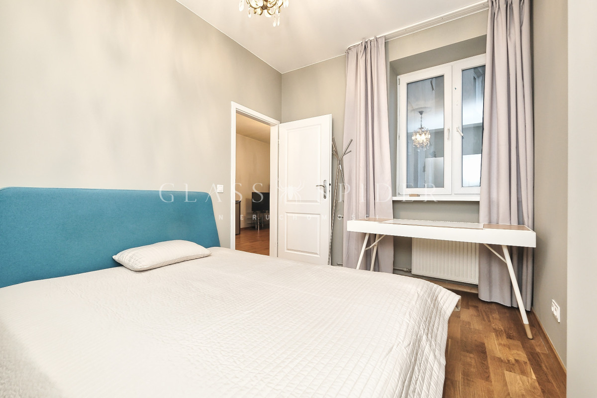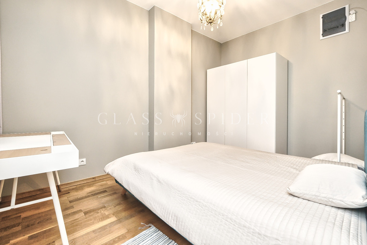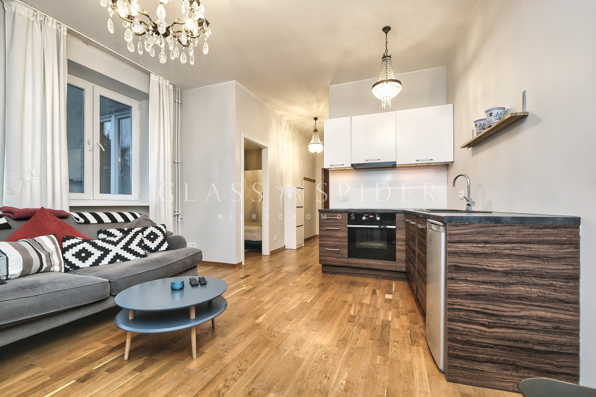 najbardziej klimatycznych części Żoliborza. Składa się z jasnego salonu połączonego z aneksem kuchennym oraz oddzielnej, przytulnej sypialni.